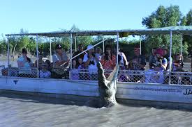 Độ 1 giờ quanh quẩn tại Fogg Dam và sau đó thì du khách được đưa tới bến các thuyền để cho khách chạy dọc theo con sông có tên là Adelaide river để xem cá sấu. Con sông bề ngang khá to độ hơn 100 m không chừng ? Nước sông đục ngàu như sông Hậu Giang vậy. Lần nầy tôi đến đây nhằm lúc nước lớn, nên không thấy bãi bùn dọc 2 bên bờ sông. Lần trước thì thấy cá sấu nằm rãi rác trên các bãi bùn như những khúc củi to. Kỳ nầy thì chỉ thấy các cá sấu trầm mình dưới nước hay lội dọc theo bờ. Hướng dẫn viên dùng một cần câu, cuối nhợ câu có buộc một cục xương bò còn dính nhiều thịt khá to … họ biết chỗ nào là vùng cư trú tự trị của mỗi con sấu có tên đàng hoàng, do các hướng dẫn viên đặt cho nó. Họ dừng thuyền bà đem cần câu thả nhữ nhữ trên mặt nước và tự nhiện từ dưới mặt nước nổi lên một con sấu thật to. Họ để cục thịt cho con sấu thấy trước rồi họ kéo lên cao dần … Cá sấu phóng lên đớp mồi cao hơn cả thước trên mặt nước. Đớp được cục mồi là nhào ầm xuống nước… thiên hạ loay hoay chụp hình, quay phim mệt nghỉ.