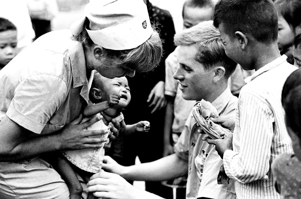 Bác sĩ và y tá của tổ chức cứu trợ Đức Malteser Hilfsdienst đang khám bệnh cho một em bé Việt Nam. Photo Courtesy