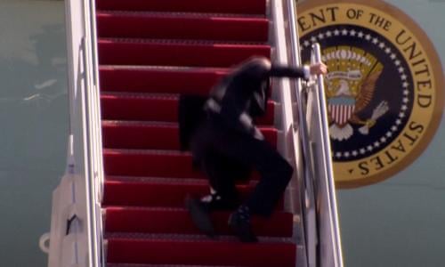 Hôm qua Biden đã té ngã đến 3 lần khi bước lên cầu thang của chiếc Air force I. Đây là cú ngã vật lý vì tuổi già, sức khỏe kém.