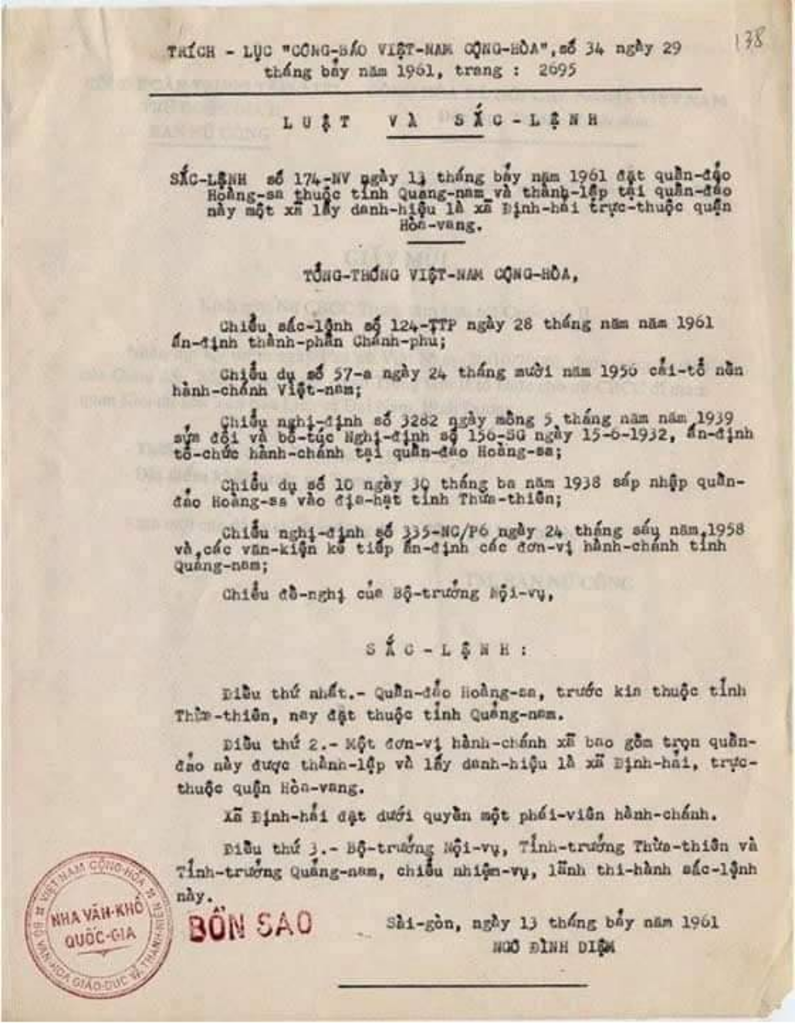 ảnh1: Sắc lệnh của TT Ngô đình Diệm về việc đặt quần đảo Hoàng Sa dưới sự quản lý của tỉnh Quảng nam, và thành lập xã Định Hải thuộc quận Hòa Vang ngày 13.7.1961.